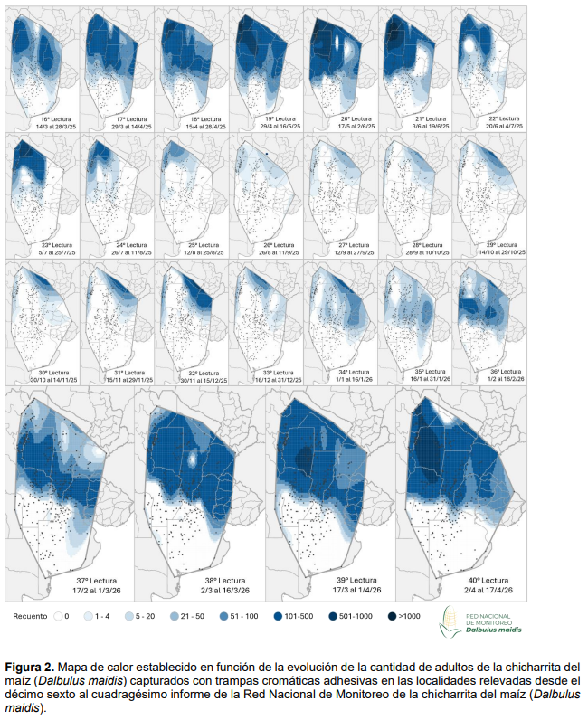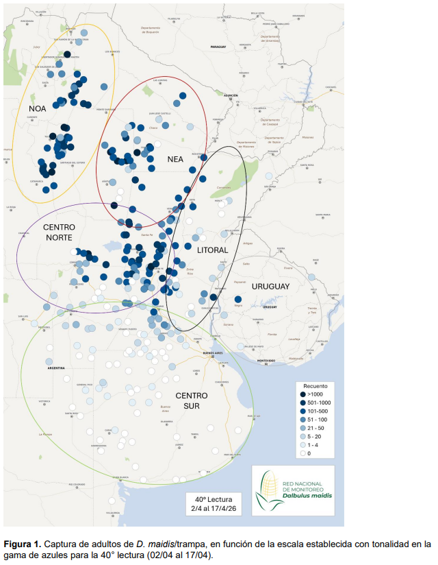 El último relevamiento de la Red Nacional de Monitoreo de Dalbulus maidis, correspondiente a su 40º informe y elaborado con datos recolectados entre el 2 y el 17 de abril de 2026, evidencia un nuevo incremento en las poblaciones de la chicharrita del maíz (Dalbulus maidis). La tendencia, que ya había sido anticipada en el informe previo, confirma que durante la campaña actual la presión del vector resulta más temprana e intensa que en 2025, particularmente en las regiones endémicas del NOA y NEA, así como en el Centro-Norte del país.