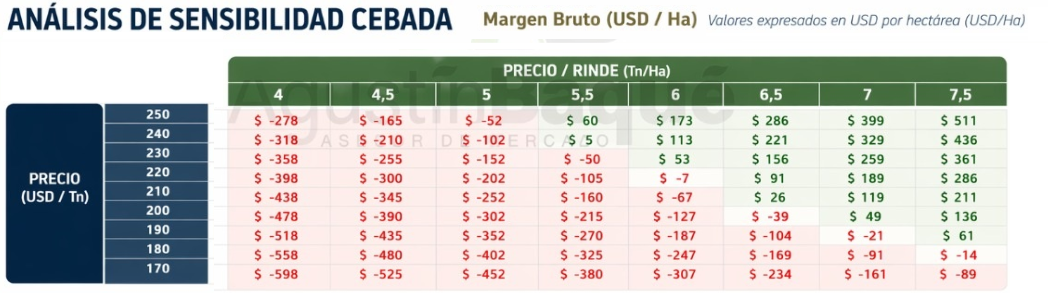 "Tomando un precio actual de forrajera de 210 u$s/tonelada para enero de 2026 (FOB equivalente 240 u$s/tonelada) y nominalmente 230 u$s/tonelada para cervecera, y asumiendo un promedio de calidad de 60% cervecera y 40% forrajera, el numero arroja margen bruto negativo", añadió.