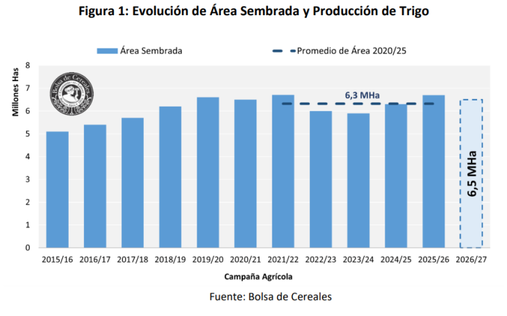 La Bolsa de Cereales de Buenos Aires publicó el 22 de abril de 2026 el Informe de Pre-Campaña N°55 para el trigo 2026/27, proyectando un área sembrada nacional de 6,5 millones de hectáreas, una leve retracción interanual del 3% que, sin embargo, se ubica un 2,8% por encima del promedio de las últimas cinco campañas.