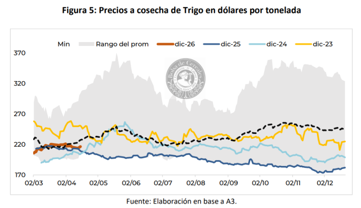 La posición a cosecha del trigo se ubica en USD 217/tn, un incremento interanual del 3%, aunque se mantiene un 3% por debajo del promedio de los últimos cinco años. Los precios de la urea y el gasoil registran subas interanuales del 36% y 25% respectivamente, mientras que el fosfato diamónico presenta una suba del 14,2% y el herbicida aumenta un 7%.