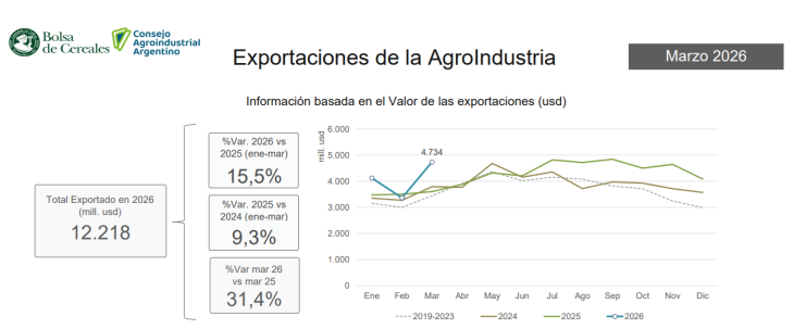 El Consejo Agroindustrial Argentino (CAA) presentó su informe mensual de exportaciones, elaborado por la Bolsa de Cereales de Buenos Aires, correspondiente a marzo de 2026, destacando un crecimiento sostenido en las ventas externas del sector. Durante el primer trimestre del año, la agroindustria acumuló exportaciones por un valor total de 12.218 millones de USD, lo que representa un incremento del 15,5% (1.642 millones de USD adicionales) en comparación con el mismo periodo de 2025.