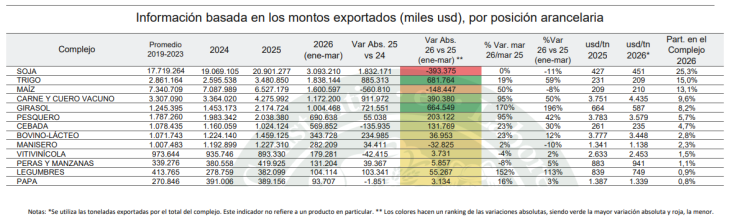 Solo en el mes de marzo, el sector exportó 4.734 millones de USD, superando en 1.132 millones de USD la cifra registrada en marzo del año anterior, lo que equivale a un salto interanual del 31,4% para dicho mes.