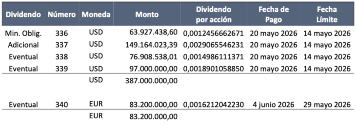 La Compañía Sud Americana de Vapores (CSAV) informó que el directorio, en sesión extraordinaria realizada hoy, acordó proponer a la Junta de Accionistas un nuevo dividendo eventual por USD 97 millones, equivalente a USD 0,0018901058850 por acción, que se cargará contra utilidades acumuladas al cierre del ejercicio 2025, teniendo derecho a percibirlos los accionistas inscritos en el Registro de Accionistas a la medianoche del día 14 de mayo de 2026.