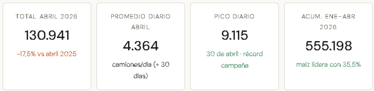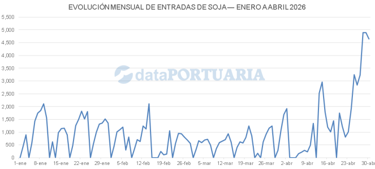 El ritmo de ingreso de soja se aceleró hacia el cierre del mes: el 28 de abril ingresaron 4.890 camiones cargados con la oleaginosa; el 29, 4.882, y el 30, 4.640. El promedio de esos tres días —4.804 entradas de soja— más que triplicó el promedio diario mensual de la oleaginosa.