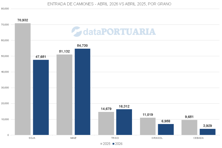 Comparado con marzo de 2026, cuando se registraron 154.312 entradas, abril registró una caída del 15,1% en el total mensual. Esa contracción responde en gran medida al repliegue del maíz —que pasó de 89.512 a 54.730 entradas, un 38,9% menos— una vez superado el pico de descarga del cereal temprano. En sentido inverso, la soja compensó parcialmente ese retroceso con su expansión del 176%.