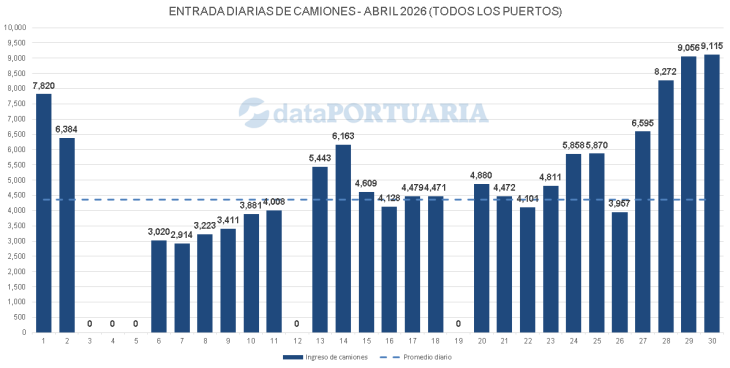En tanto, el consolidado nacional de todos los puertos alcanzó en esas mismas jornadas sus valores más altos del mes: 8.272, 9.056 y 9.115 entradas respectivamente, con el Gran Rosario aportando 6.276 el día 29 y 6.035 el día 30, sumando más de 12.000 ingresos en solo dos jornadas.