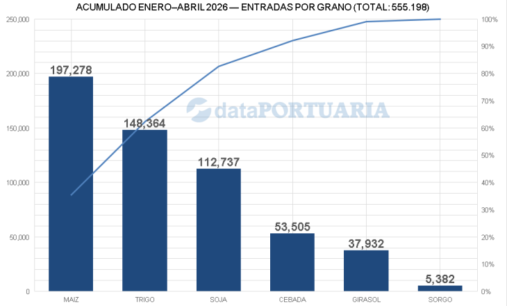El trigo aportó con 148.364 entradas en el cuatrimestre —el 26,7% del total—, con un crecimiento del 11,1% interanual en abril respecto del mismo mes de 2025. La cebada sumó 53.505 unidades (9,6%) y el girasol, 37.932 (6,8%).