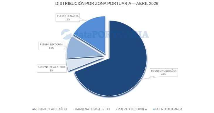 En términos de distribución geográfica, el cordón Rosario y aledaños absorbió el 79,1% de las entradas de abril de 2026, con 103.601 camiones. Puerto Bahía Blanca aportó el 12,4%, la Dársena de Buenos Aires y Entre Ríos el 5,3% con 6.911, y Puerto Quequén el 3,2% con 4.243.